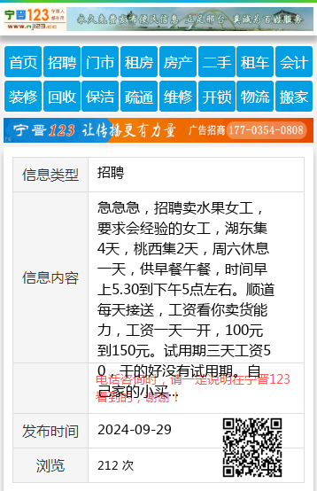 急急急,招聘卖水果女工,要求会经验的女工,湖东集4天,桃西集2天,周六休息一天,供早餐午餐,时间早上5.30到下午5点左右。顺道每天接送,工资看你卖货能力,工资一天一开,100元到150元。试用期三天工资50,干的好没有试用期。自己家的小买卖,没那么多事。电话13384645057,微信同号。大家帮你转发一下。[合十][合十][合十]马13384645057 【电话咨询时,请一定说明在七台河信息网看到的,谢谢!】 |