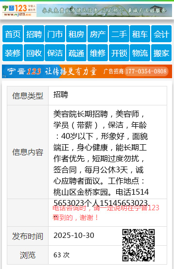 美容院长期招聘,美容师,学员(带薪),保洁,年龄:40岁以下,形象好,面貌端正,身心健康,能长期工作者优先,短期过度勿扰,签合同,每月公休3天,诚心应聘者面议。工作地点:桃山区金桥家园。电话15145653023个人15145653023 【电话咨询时,请一定说明在七台河信息网看到的,谢谢!】 |