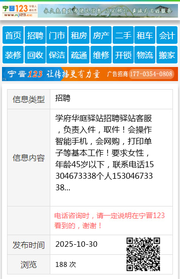 学府华庭驿站招聘驿站客服,负责入件,取件!会操作智能手机,会网购,打印单子等基本工作!要求女性,年龄45岁以下,联系电话15304673338个人15304673338 【电话咨询时,请一定说明在七台河信息网看到的,谢谢!】 |