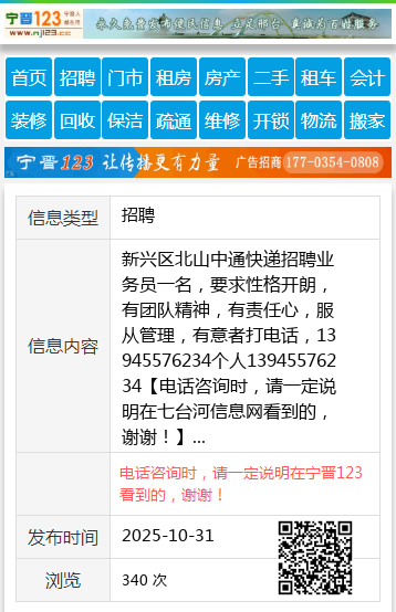 新兴区北山中通快递招聘业务员一名,要求性格开朗,有团队精神,有责任心,服从管理,有意者打电话,13945576234个人13945576234 【电话咨询时,请一定说明在七台河信息网看到的,谢谢!】 |