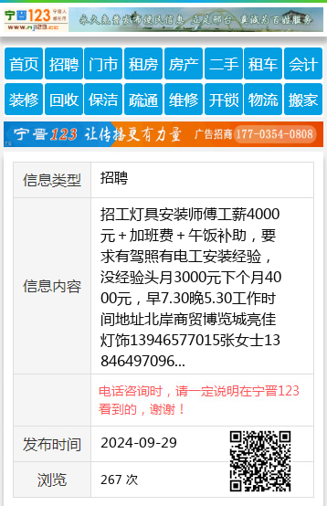 招工灯具安装师傅工薪4000元+加班费+午饭补助,要求有驾照有电工安装经验,没经验头月3000元下个月4000元,早7.30晚5.30工作时间地址北岸商贸博览城亮佳灯饰13946577015张女士13846497096 【电话咨询时,请一定说明在七台河信息网看到的,谢谢!】 |