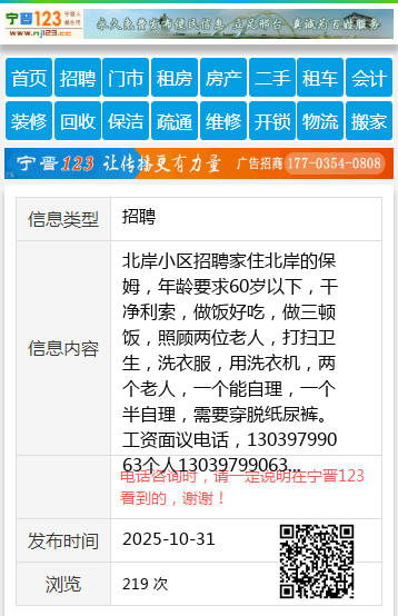 北岸小区招聘家住北岸的保姆,年龄要求60岁以下,干净利索,做饭好吃,做三顿饭,照顾两位老人,打扫卫生,洗衣服,用洗衣机,两个老人,一个能自理,一个半自理,需要穿脱纸尿裤。工资面议电话,13039799063个人13039799063 【电话咨询时,请一定说明在七台河信息网看到的,谢谢!】 |