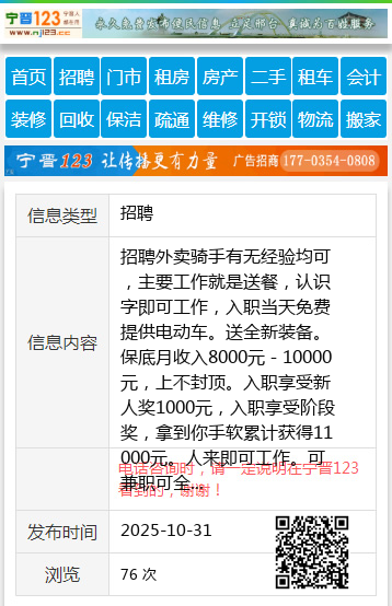 招聘外卖骑手有无经验均可,主要工作就是送餐,认识字即可工作,入职当天免费提供电动车。送全新装备。保底月收入8000元-10000元,上不封顶。入职享受新人奖1000元,入职享受阶段奖,拿到你手软累计获得11000元。人来即可工作。可兼职可全职.有专人指导。领着你跑。软件自带导航,自带地图。精准到小区楼号。另招聘兼职骑手,工资4000-6000工作时间自由安排。2.全职工作时间:早6-晚6.早9晚9.中午11-晚12点,三班倒,中午休息2小时.3.岗位要求:18周岁-50周岁 会骑电动车或者摩托车。会用智能手机,会使用导航即可有专人指导教学。不用担心找不到地址 也不要担心不会干,人来即可上岗。4.工作地点:桃山区,茄子区,新兴区3站点都可以入职。联系电话:18746415201(微信同步)个人18746415201 【电话咨询时,请一定说明在七台河信息网看到的,谢谢!】 |