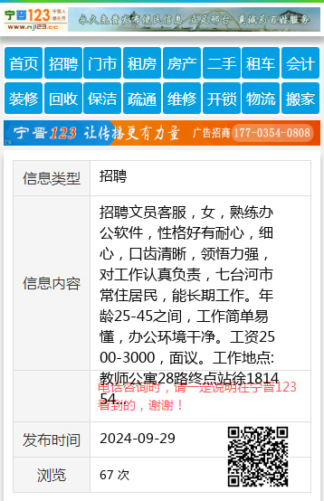 招聘文员客服,女,熟练办公软件,性格好有耐心,细心,口齿清晰,领悟力强,对工作认真负责,七台河市常住居民,能长期工作。年龄25-45之间,工作简单易懂,办公环境干净。工资2500-3000,面议。工作地点:教师公寓28路终点站徐18145403355 【电话咨询时,请一定说明在七台河信息网看到的,谢谢!】 |