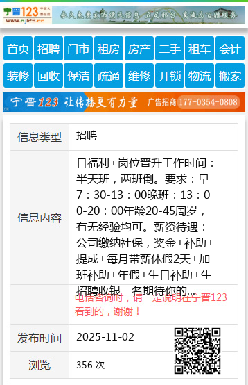 日福利+岗位晋升工作时间:半天班,两班倒。要求:早7:30-13:00晚班:13:00-20:00年龄20-45周岁,有无经验均可。薪资待遇:公司缴纳社保,奖金+补助+提成+每月带薪休假2天+加班补助+年假+生日补助+生招聘收银一名期待你的加入郭女士13846427598 【电话咨询时,请一定说明在七台河信息网看到的,谢谢!】 |