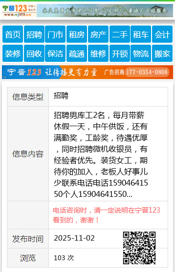 招聘男库工2名,每月带薪休假一天,中午供饭,还有满勤奖,工龄奖,待遇优厚,同时招聘微机收银员,有经验者优先。装货女工,期待你的加入,老板人好事儿少联系电话电话15904641550个人15904641550 【电话咨询时,请一定说明在七台河信息网看到的,谢谢!】 |