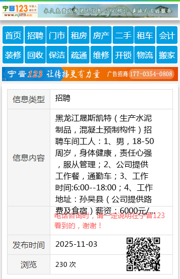 黑龙江晟斯凯特(生产水泥制品,混凝土预制构件)招聘车间工人:1、男,18-50周岁,身体健康,责任心强,服从管理;2、公司提供工作餐,通勤车;3、工作时间:6:00--18:00;4、工作地址:孙吴县(公司提供路费及食宿)薪资:6000元/月以上联系电话:13846479963公司地址:七台河市茄子河区大唐电厂里侧4000米(龙洋焦电北侧500米)。个人13846479963 |