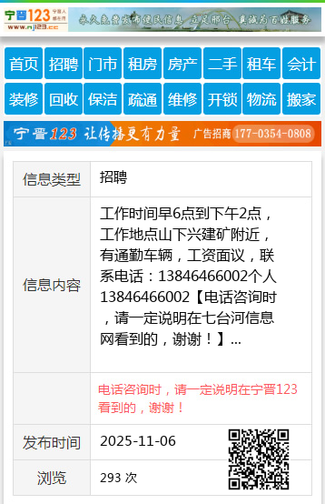 工作时间早6点到下午2点,工作地点山下兴建矿附近,有通勤车辆,工资面议,联系电话:13846466002个人13846466002 【电话咨询时,请一定说明在七台河信息网看到的,谢谢!】 |