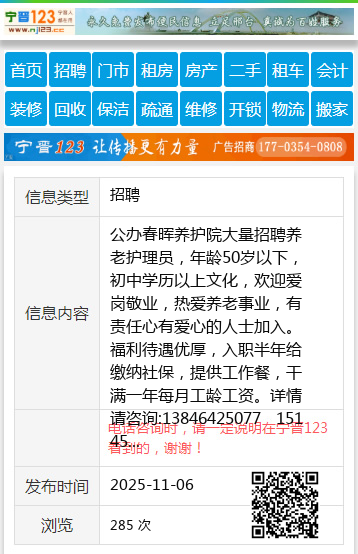 公办春晖养护院大量招聘养老护理员,年龄50岁以下,初中学历以上文化,欢迎爱岗敬业,热爱养老事业,有责任心有爱心的人士加入。福利待遇优厚,入职半年给缴纳社保,提供工作餐,干满一年每月工龄工资。详情请咨询:13846425077 15145652774个人13846425077 【电话咨询时,请一定说明在七台河信息网看到的,谢谢!】 |