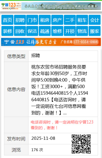 桃东农贸市场招聘服务员要求女年龄30到50岁,工作时间早5:00到晚4:00,中午供饭!工资3000+,满勤500 电话15946440815个人15946440815 【电话咨询时,请一定说明在七台河信息网看到的,谢谢!】 |
