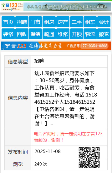 幼儿园食堂招帮厨要求如下:30~50周岁,身体健康,工作认真,吃苦耐劳,有食堂帮厨工作经验。电话:15184615252个人15184615252 【电话咨询时,请一定说明在七台河信息网看到的,谢谢!】 |