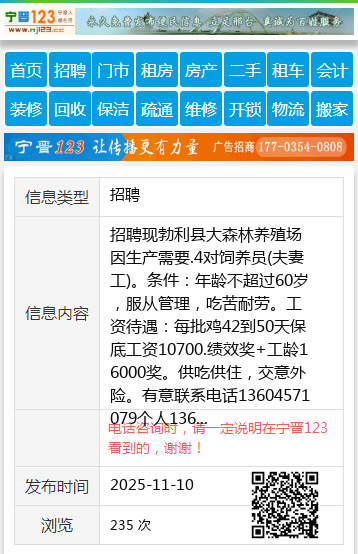 招聘现勃利县大森林养殖场因生产需要.4对饲养员(夫妻工)。条件:年龄不超过60岁,服从管理,吃苦耐劳。工资待遇:每批鸡42到50天保底工资10700.绩效奖+工龄16000奖。供吃供住,交意外险。有意联系电话13604571079个人13604571079 【电话咨询时,请一定说明在七台河信息网看到的,谢谢!】 |