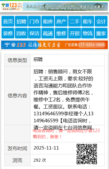 招聘:销售顾问,男女不限,工资无上限,要求:较好的语言沟通能力和团队合作协作精神,售后维修师傅2名,维修中工2名,免费提供午餐。工资面议。联系电话:13149646599李经理个人13149646599 【电话咨询时,请一定说明在七台河信息网看到的,谢谢!】 |