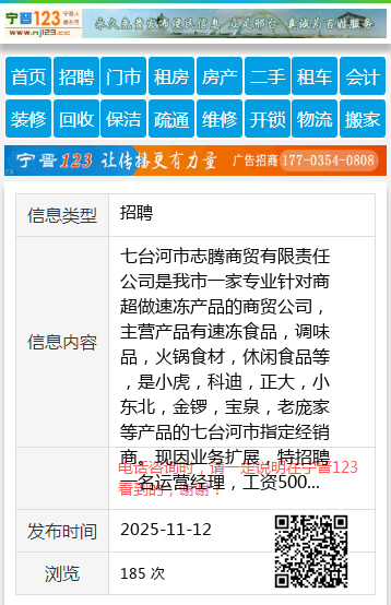 七台河市志腾商贸有限责任公司是我市一家专业针对商超做速冻产品的商贸公司,主营产品有速冻食品,调味品,火锅食材,休闲食品等,是小虎,科迪,正大,小东北,金锣,宝泉,老庞家等产品的七台河市指定经销商。现因业务扩展,特招聘一名运营经理,工资5000+按销售业绩提成,销售越多工资越高,要求品貌端庄,有一定的销售谈判能力,建设组织架构能力负责组建销售团队,并且相关工作一年以上的工作经验,有意者请联系,微信电话同号15046406678.个人15046406678 【电话咨询时,请一定说明在七台河信息网看到的,谢谢!】 |