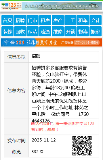 招聘拼多多客服要求有销售经验,会电脑打字,带薪休两天底薪2000+提成,多劳多得,年龄18到40 晚班上班时间 中午12点到晚上11点能上晚班的优先吃饭休息一个半小时工作地址 林苑之星电话 微信同号 17604643126个人17604643126 【电话咨询时,请一定说明在七台河信息网看到的,谢谢!】 |
