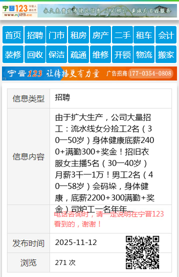 由于扩大生产,公司大量招工:流水线女分捡工2名(30一50岁)身体健康底薪2400+满勤300+奖金!招旧衣服女主播5名(30一40岁)月薪3千一1万!男工2名(40一58岁)会码垛,身体健康,底薪2200+300满勤+奖金)司炉工一名年年龄不限,身体健康,早5点一8点烧锅炉!工资1000元公司晋升空间大,车间主任,厂长一职等你来,只要你有能力,利丰公司永远给你施展的空间!选择利丰,让你富贵一生!!试用期3天。额满为止!早7:30一16:30中午管饭!厂址:新兴区宝泰隆路26号。公交路线:坐(走葫芦头沟的)1路公交车到(家居广场)站点前走100米恒阳科技公司红大门院内。☎️13946506087个人13946506087 【电话咨询时,请一定说明在七台河信息网看到的,谢谢!】 |