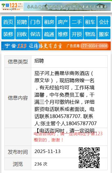 茄子河上善晟华商务酒店(原文华),现招聘房嫂一名,有无经验均可,工作环境温馨,中午免费员工餐,干满三个月可缴纳社保,详细薪资电话联系或者面谈。电话联系18045787707. 联系人:张主管个人18045787707 【电话咨询时,请一定说明在七台河信息网看到的,谢谢!】 |