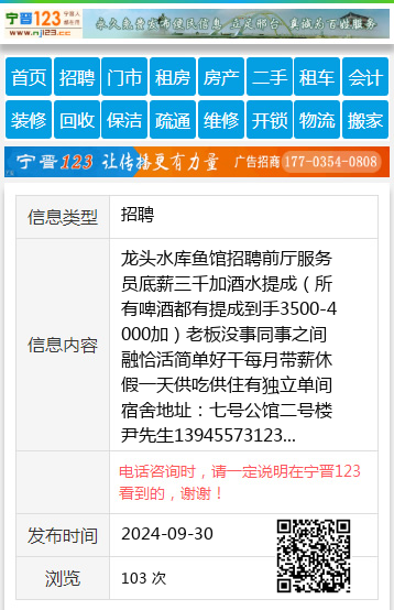 龙头水库鱼馆招聘前厅服务员底薪三千加酒水提成(所有啤酒都有提成到手3500-4000加)老板没事同事之间融恰活简单好干每月带薪休假一天供吃供住有独立单间宿舍地址:七号公馆二号楼尹先生13945573123 【电话咨询时,请一定说明在七台河信息网看到的,谢谢!】 |