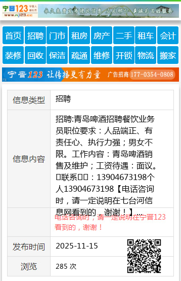 招聘:青岛啤酒招聘餐饮业务员职位要求:人品端正、有责任心、执行力强;男女不限。工作内容:青岛啤酒销售及维护;工资待遇:面议。联系☎️:13904673198个人13904673198 【电话咨询时,请一定说明在七台河信息网看到的,谢谢!】 |