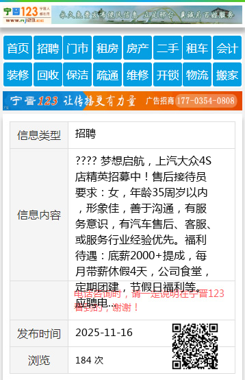 ???? 梦想启航,上汽大众4S店精英招募中!售后接待员要求:女,年龄35周岁以内,形象佳,善于沟通,有服务意识,有汽车售后、客服、或服务行业经验优先。福利待遇:底薪2000+提成,每月带薪休假4天,公司食堂,定期团建,节假日福利等。应聘电话:原经理 18714649878个人18714649878 【电话咨询时,请一定说明在七台河信息网看到的,谢谢!】 |
