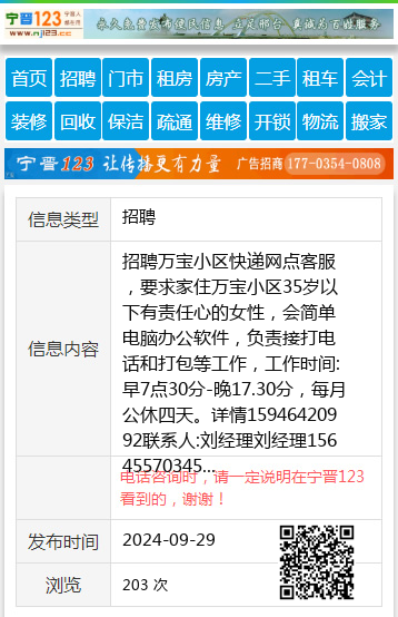 招聘万宝小区快递网点客服,要求家住万宝小区35岁以下有责任心的女性,会简单电脑办公软件,负责接打电话和打包等工作,工作时间:早7点30分-晚17.30分,每月公休四天。详情15946420992联系人:刘经理刘经理15645570345 【电话咨询时,请一定说明在七台河信息网看到的,谢谢!】 |