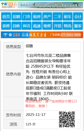 七台河市东北亚二楼品牌集合店招聘服装女导购要求年龄 25到45岁以下 有经验优先 性格开朗 有责任心和上进心 品牌女装 明码标价 能长期稳定者优先 薪资待遇 底薪➕提成➕满勤奖➕工龄奖 年节福利 工作时间8小时 联系电话 18045780578个人18045780578 【电话咨询时,请一定说明在七台河信息网看到的,谢谢!】 |