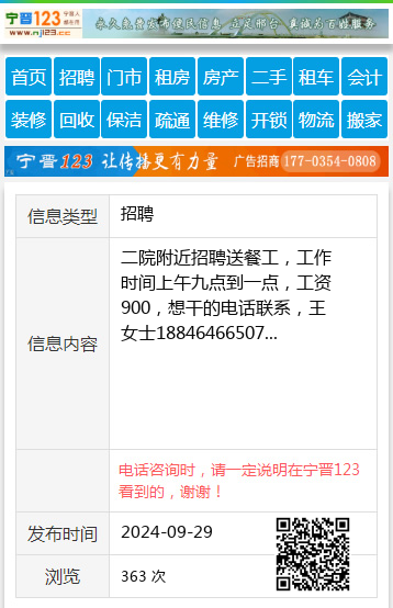 二院附近招聘送餐工,工作时间上午九点到一点,工资900,想干的电话联系,王女士18846466507