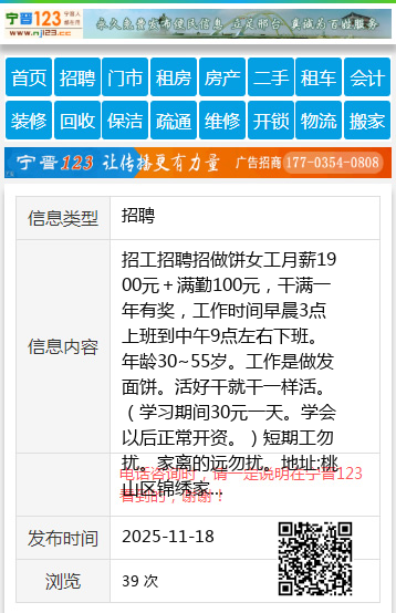招工招聘招做饼女工月薪1900元+满勤100元,干满一年有奖,工作时间早晨3点上班到中午9点左右下班。年龄30~55岁。工作是做发面饼。活好干就干一样活。(学习期间30元一天。学会以后正常开资。)短期工勿扰。家离的远勿扰。地址:桃山区锦绣家园4号楼。电话:18846465914个人18846465914 【电话咨询时,请一定说明在七台河信息网看到的,谢谢!】 |