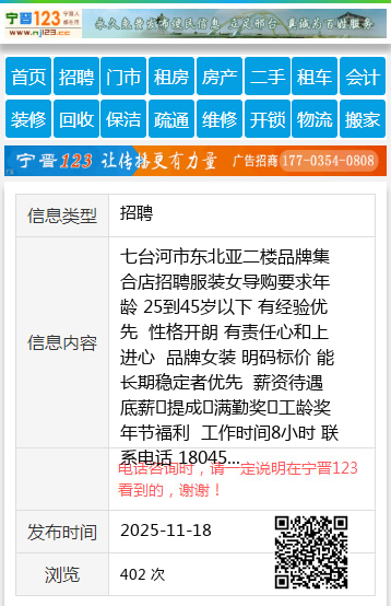 七台河市东北亚二楼品牌集合店招聘服装女导购要求年龄 25到45岁以下 有经验优先 性格开朗 有责任心和上进心 品牌女装 明码标价 能长期稳定者优先 薪资待遇 底薪➕提成➕满勤奖➕工龄奖 年节福利 工作时间8小时 联系电话 18045780578个人18045780578 【电话咨询时,请一定说明在七台河信息网看到的,谢谢!】 |