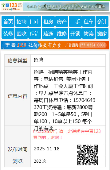 招聘 招聘精英精英工作内容:电话销售 美团业务工作地点:工会大厦工作时间:早九点半晚五点休息日:每周日休息电话:15704649370工资待遇:底薪2800满勤200 1~5单是50,5到十单100,10单以上150 每个月的有奖励1000 完成一定单量奖励1000 轻轻松松月入六七千 工作氛围好 总公司在哈尔滨个人15704649370 【电话咨询时,请一定说明在七台河信息网看到的,谢谢!】 |