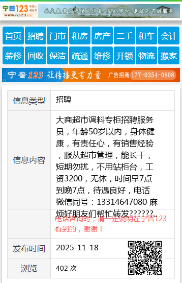 大商超市调料专柜招聘服务员,年龄50岁以内,身体健康,有责任心,有销售经验,服从超市管理,能长干,短期勿扰,不用站柜台,工资3200,无休,时间早7点到晚7点,待遇良好,电话微信同号:13314647080 麻烦好朋友们帮忙转发????????个人13314647080 【电话咨询时,请一定说明在七台河信息网看到的,谢谢!】 |
