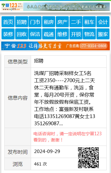 洗煤厂招聘采制样女工5名工资2350----2700元上二天休二天有通勤车,洗浴,食堂,每月20号开资,保你常年不放假放假有保底工资。工作地点:富强新发村联系电话13351269087黄女士13351269087 【电话咨询时,请一定说明在七台河信息网看到的,谢谢!】 |