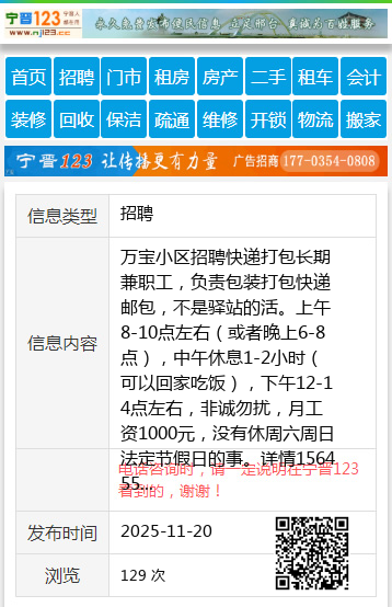 万宝小区招聘快递打包长期兼职工,负责包装打包快递邮包,不是驿站的活。上午8-10点左右(或者晚上6-8点),中午休息1-2小时(可以回家吃饭),下午12-14点左右,非诚勿扰,月工资1000元,没有休周六周日法定节假日的事。详情15645570345个人15645570345 【电话咨询时,请一定说明在七台河信息网看到的,谢谢!】 |