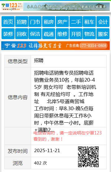 招聘电话销售专员招聘电话销售业务员10名,年龄20-45岁 男女均可 老带新培训机制 有无经验均可 。工作地址 北岸5号道商贸城 工作时间:早8.30-晚5点每周日带薪休息每天工作8小时,中午休息一小时。底薪+满勤2800 普通员工综合工资7000 精英员工8-12000 ,不要想着拿底薪 公司没有拿底薪的员工 公司员工70? 目前精英单王 工资15000 薪资真实无水分 只要你努力,必须有回报。地址:七台河桃山区多伦多联系人:崔先生联系方式:18904645551个人18904645551 【电话咨询时,请一定说明在七台河信息网看到的,谢谢!】 |