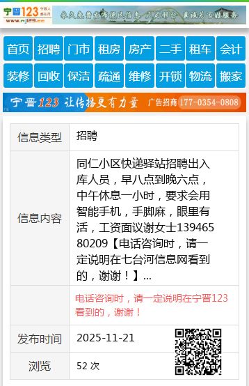 同仁小区快递驿站招聘出入库人员,早八点到晚六点,中午休息一小时,要求会用智能手机,手脚麻,眼里有活,工资面议谢女士13946580209 【电话咨询时,请一定说明在七台河信息网看到的,谢谢!】 |