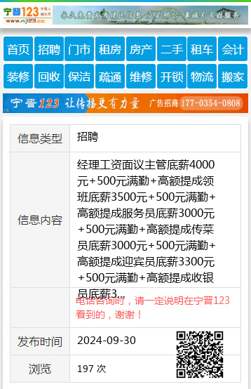 经理工资面议主管底薪4000元+500元满勤+高额提成领班底薪3500元+500元满勤+高额提成服务员底薪3000元+500元满勤+高额提成传菜员底薪3000元+500元满勤+高额提成迎宾员底薪3300元+500元满勤+高额提成收银员底薪3300元+500元满勤+高额提成小件员底薪2500元+500元满勤卫生员底薪2500元+500元满勤厨师长工资面议刨肉底薪3300元+500元满勤切肉底薪2600元+500元满勤摆肉底薪2500元+500元满勤凉菜员底薪2500元+500元满勤切配员底薪2500元+500元满勤配锅员底薪2500元+500元满勤青菜员底薪2500元+500元满勤小料员底薪2500元+500元满勤汤间主食底薪2500元+500元满勤洗碗员底薪2500元+500元满勤福利:1.以上岗位,每三个月涨50元岗位工资,两年封顶。2.以上员工免费提供一日三餐。3.以上员工免费提供舒适员工宿舍。4.每位员工每月享受带薪休假(前厅员工4个半天休息,后厨员工2个半天休息)5.每月定期举行员工生日会(提供蛋糕及礼品)6.为每位员工提供完整的岗位技能培训7.为员工免费提供意外伤害保险工作轻松,环境舒适,有梦想,敢作为,等待有能力的你有工作经验者优先录用应聘电话:15946428567张女士店面地址:七小对面,金星花园东门王18346464046 【电话咨询时,请一定说明在七台河信息网看到的,谢谢!】 |