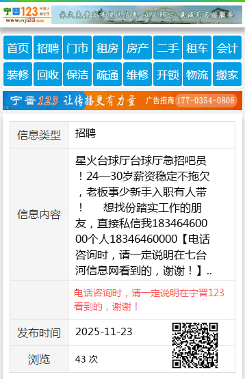 星火台球厅台球厅急招吧员!24—30岁薪资稳定不拖欠,老板事少新手入职有人带! 想找份踏实工作的朋友,直接私信我18346460000个人18346460000 【电话咨询时,请一定说明在七台河信息网看到的,谢谢!】 |