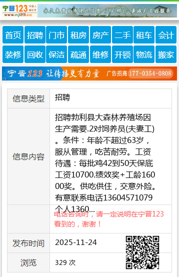 招聘勃利县大森林养殖场因生产需要.2对饲养员(夫妻工)。条件:年龄不超过63岁,服从管理,吃苦耐劳。工资待遇:每批鸡42到50天保底工资10700.绩效奖+工龄16000奖。供吃供住,交意外险。有意联系电话13604571079个人13604571079 【电话咨询时,请一定说明在七台河信息网看到的,谢谢!】 |