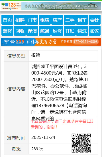 诚招成手平面设计员3名,3000-4500元/月。实习生2名2000-2500元/月。熟练使用PS软件、办公软件。地点桃山区花园路12号,市政府附近。不加微信电话联系时经理18746406528 【电话咨询时,请一定说明在七台河信息网看到的,谢谢!】 |