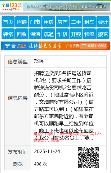 招聘送货员5名招聘送货司机3名(要求长期工作)招聘送冻货司机2名要求吃苦耐劳,(地址富强小区附近,文浩商贸有限公司)(做五路车可以到)(如果家在新东方惠民附近的,有老司机可以顺路早上给拉到单位,晚上下班也可以坐车回家)我公司有30名员工,能长期工作的,欢迎你的加入电话13199231100个人13199231100 【电话咨询时,请一定说明在七台河信息网看到的,谢谢!】 |