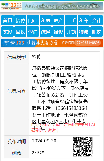 舒适曼服装公司招聘招聘岗位:锁眼.钉扣工.缝纫.零活工招聘条件:男女不限,年龄18~40岁以下,身体健康,吃苦耐劳薪资:计件工资,上不封顶有经验宝妈优先联系电话:13664648336崔女士工作地址:七台河新兴区七星花园A区步行街崔女士13664648336 【电话咨询时,请一定说明在七台河信息网看到的,谢谢!】 |