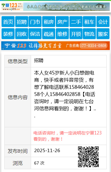 本人女45岁新人小白想做电商,快手或者抖音带货,有想了解电话联系15846402858个人15846402858