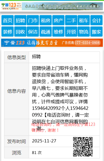 招聘快递上门取件业务员,要求自带省油车辆,懂网购退换货,会使用智能手机,早八晚七,要求长期短期不用,心高气傲脾气暴躁者勿扰,计件或提成可议,详情15946420992个人15946420992 【电话咨询时,请一定说明在七台河信息网看到的,谢谢!】 |
