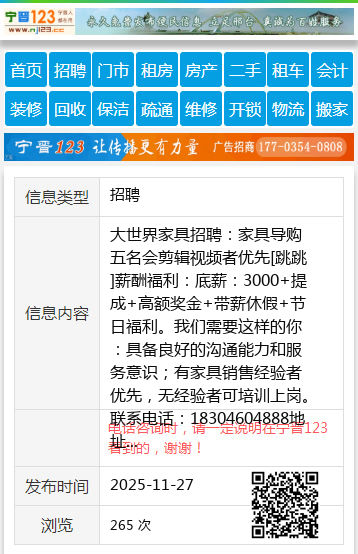 大世界家具招聘:家具导购五名会剪辑视频者优先[跳跳]薪酬福利:底薪:3000+提成+高额奖金+带薪休假+节日福利。我们需要这样的你:具备良好的沟通能力和服务意识;有家具销售经验者优先,无经验者可培训上岗。联系电话:18304604888地址:富康花园东门富一层个人18304604888 【电话咨询时,请一定说明在七台河信息网看到的,谢谢!】 |