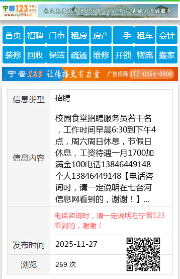 校园食堂招聘服务员若干名,工作时间早晨6:30到下午4点,周六周日休息,节假日休息,工资待遇一月1700加满金100电话13846449148个人13846449148 【电话咨询时,请一定说明在七台河信息网看到的,谢谢!】 |
