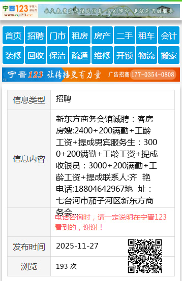 新东方商务会馆诚聘:客房房嫂:2400+200满勤+工龄工资+提成男宾服务生:3000+200满勤+工龄工资+提成收银员:3000+200满勤+工龄工资+提成联系人:齐 艳电话:18804642967地 址:七台河市茄子河区新东方商务会馆。个人18804642967 【电话咨询时,请一定说明在七台河信息网看到的,谢谢!】 |