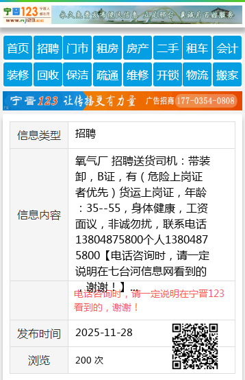 氧气厂 招聘送货司机:带装卸,B证,有(危险上岗证者优先)货运上岗证,年龄:35--55,身体健康,工资面议,非诚勿扰,联系电话13804875800个人13804875800 【电话咨询时,请一定说明在七台河信息网看到的,谢谢!】 |