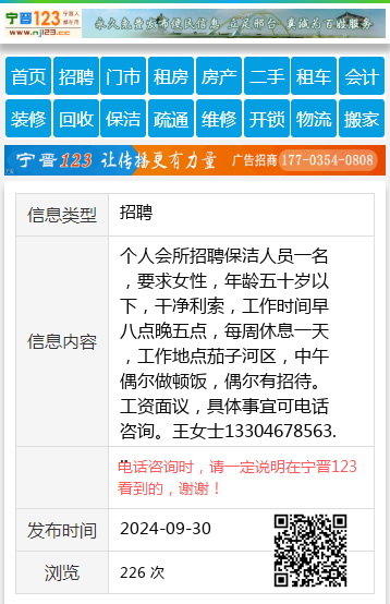 个人会所招聘保洁人员一名,要求女性,年龄五十岁以下,干净利索,工作时间早八点晚五点,每周休息一天,工作地点茄子河区,中午偶尔做顿饭,偶尔有招待。工资面议,具体事宜可电话咨询。王女士13304678563 【电话咨询时,请一定说明在七台河信息网看到的,谢谢!】 |