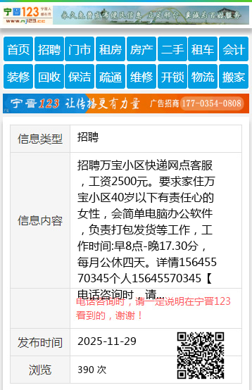 招聘万宝小区快递网点客服,工资2500元。要求家住万宝小区40岁以下有责任心的女性,会简单电脑办公软件,负责打包发货等工作,工作时间:早8点-晚17.30分,每月公休四天。详情15645570345个人15645570345 【电话咨询时,请一定说明在七台河信息网看到的,谢谢!】 |