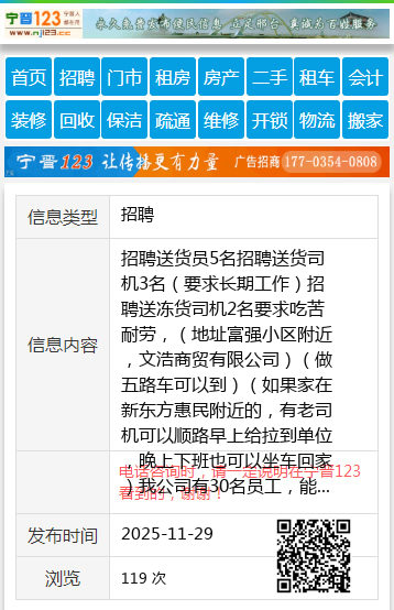 招聘送货员5名招聘送货司机3名(要求长期工作)招聘送冻货司机2名要求吃苦耐劳,(地址富强小区附近,文浩商贸有限公司)(做五路车可以到)(如果家在新东方惠民附近的,有老司机可以顺路早上给拉到单位,晚上下班也可以坐车回家)我公司有30名员工,能长期工作的,欢迎你的加入电话13199231100个人13199231100 【电话咨询时,请一定说明在七台河信息网看到的,谢谢!】 |